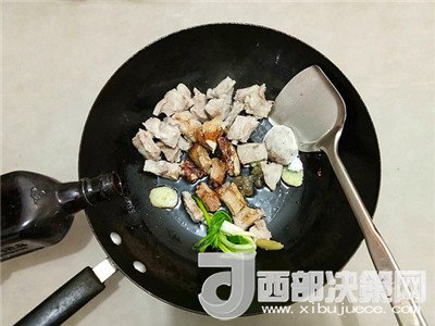 5.鍋中放少許油,放入焯過水的排骨稍微炒一下,放入生抽、老抽、冰糖、燉肉料包、生姜、香蔥等調(diào)料