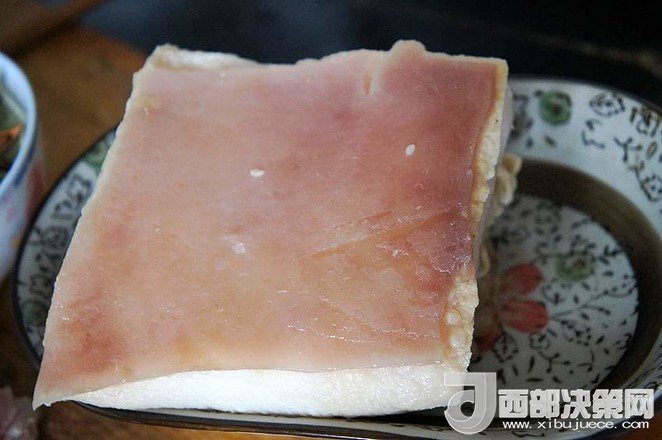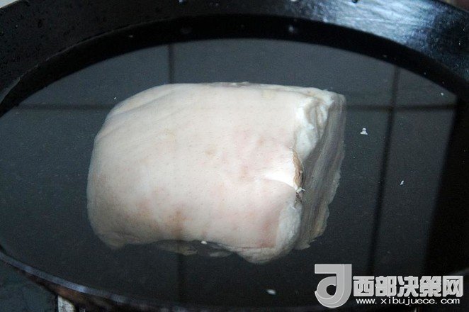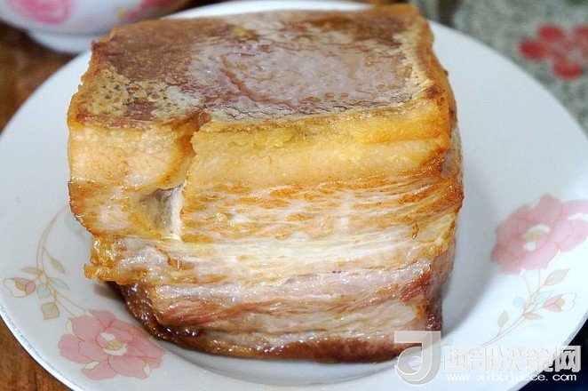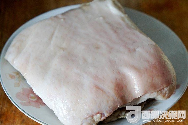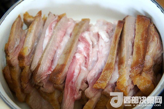 9.待五花肉稍微冷卻至不燙手時(shí),將其切成肉片,皮朝下碼入圓底的搪瓷盆中,待用
