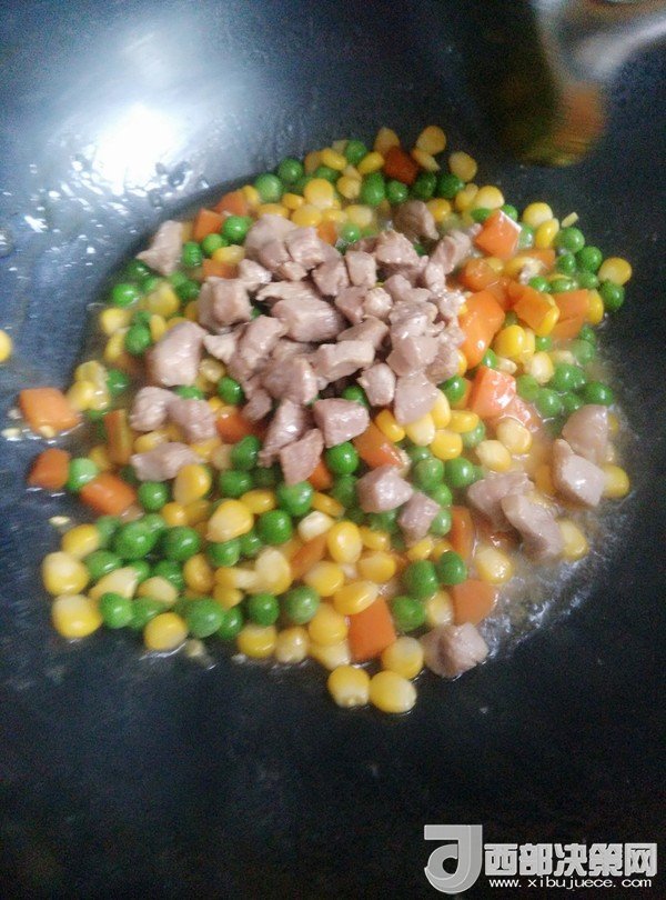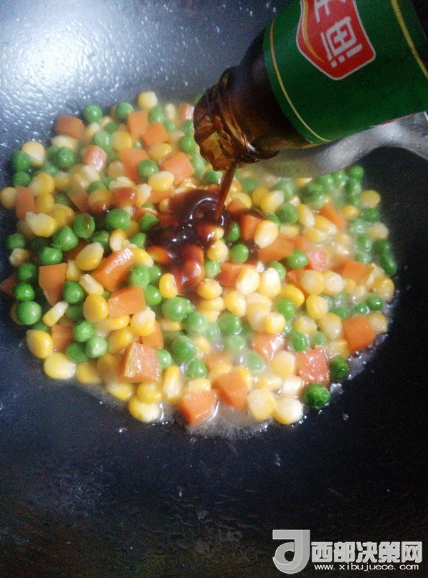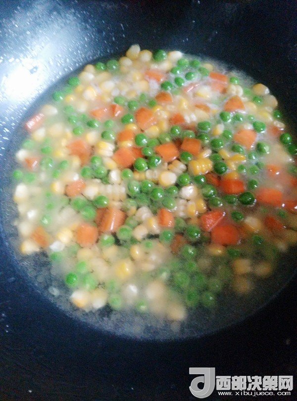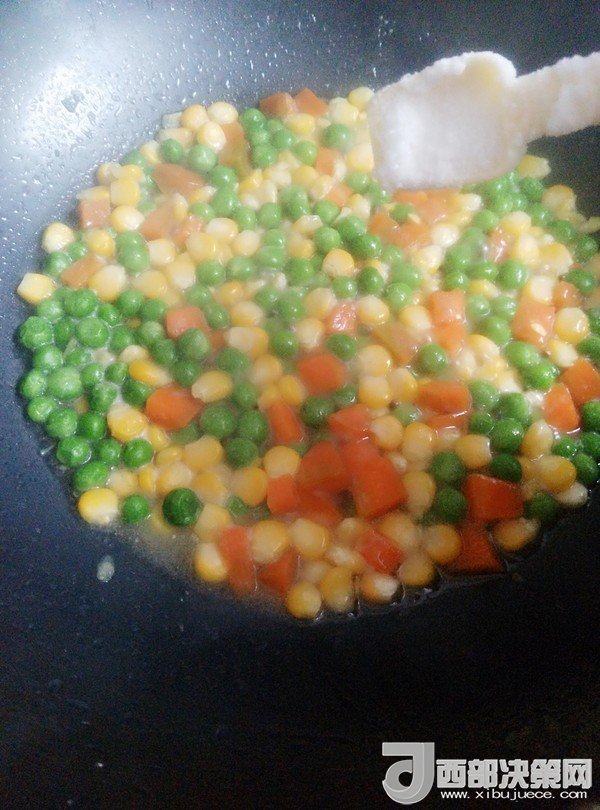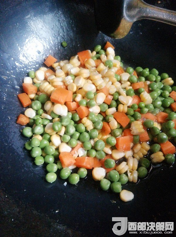 7.鍋留底油,放入豌豆、胡蘿卜、玉米粒炒一會(huì)