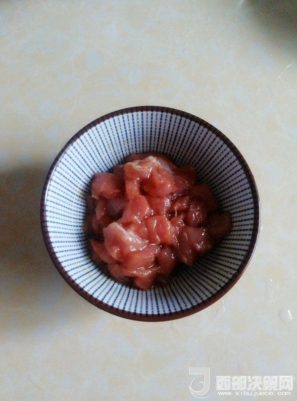 2.里脊肉去筋膜,洗凈切丁,放入少許鹽、生抽、料酒抓勻,腌制片刻