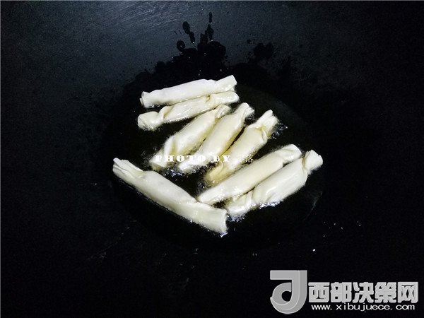 8.炒鍋里倒入稍微多一點的植物油;油鍋燒熱,轉小火;放入“糖果”炸至金黃;