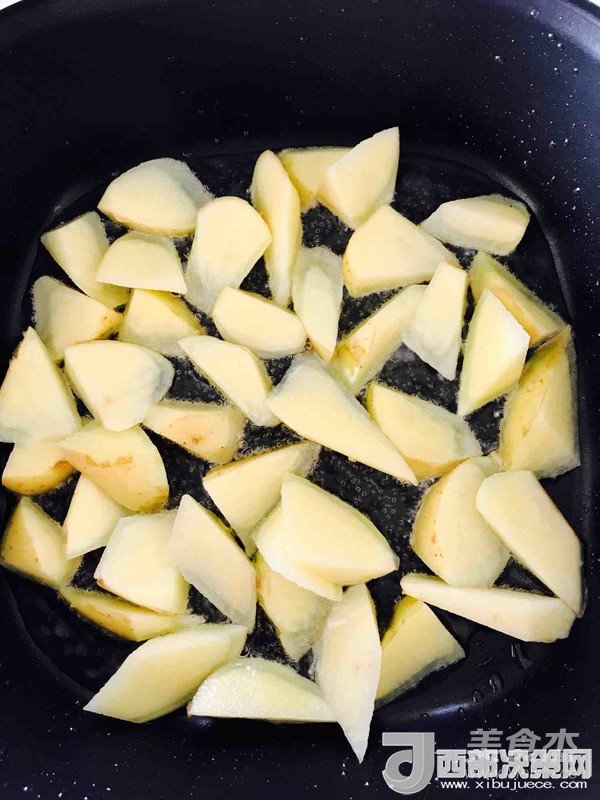 2.開小火,鍋中倒入偏多一些的油,油熱下入土豆,小火慢煎。(油能莫過土豆底層就行)