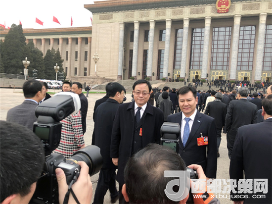 (圖為全國人大代表張近東在十三屆全國人大一次會議上接受記者采訪)