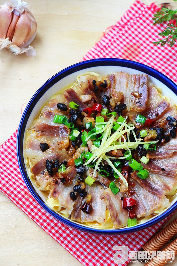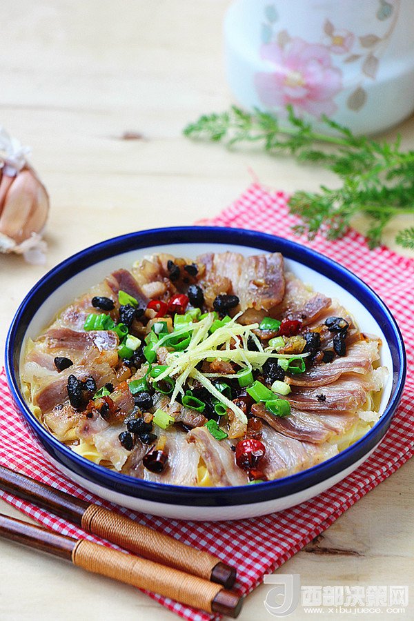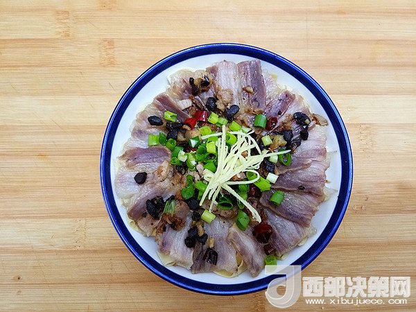 10.蒸好的咸肉千張取出,撒上剩余的蔥末和姜絲。