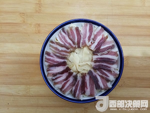 6.切好的咸肉碼在千張上。