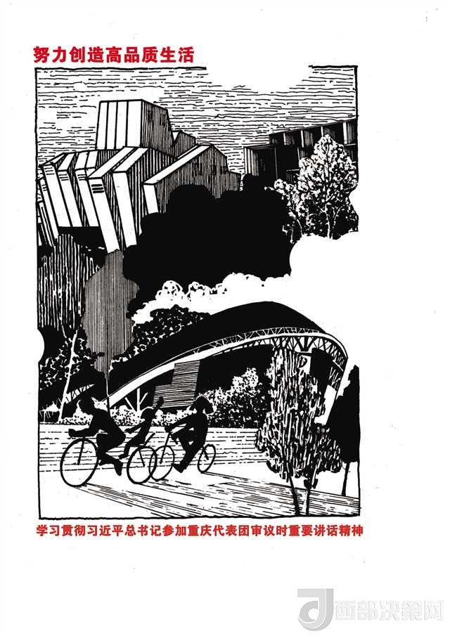 另一組負(fù)責(zé)“創(chuàng)造高品質(zhì)生活”的師生也遭遇類似的問題。最初師生們想用一組市民在公園鍛煉的場(chǎng)景來闡述這個(gè)主題,但很快就發(fā)現(xiàn)這樣的畫面太簡(jiǎn)單蒼白。最終,他們將重慶大劇院、重慶美術(shù)館、奧體中心等重慶的標(biāo)志性建筑作為文化符號(hào)列入畫稿中,才有了令人耳目一新的感覺。