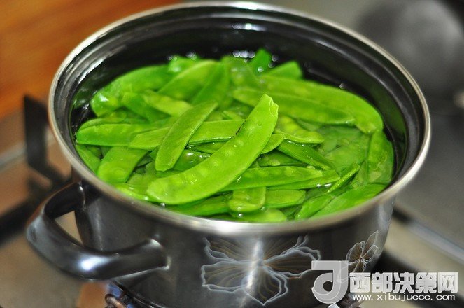 5.水燒開,加點(diǎn)油和鹽,把荷蘭豆下入焯燙斷生。撈出過涼。這樣更綠。