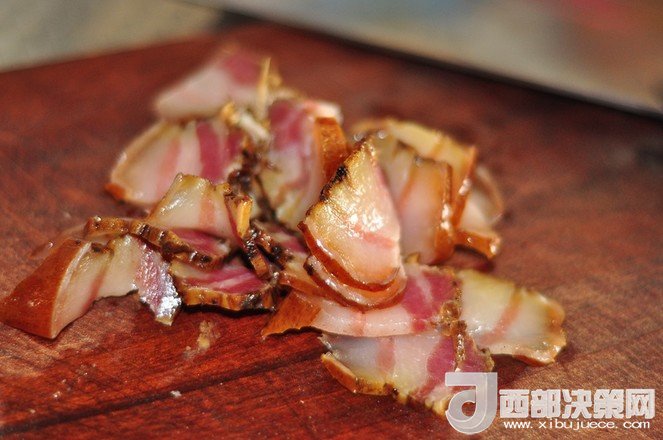 1.臘肉洗凈蒸熟切薄片