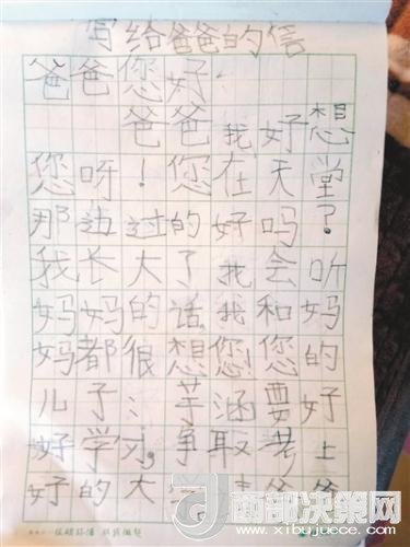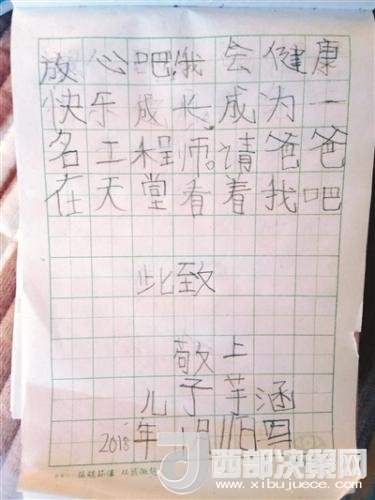 “爸爸您好。爸爸我好想您呀!您在天堂那邊過的好嗎?我長大了,我會(huì)聽媽媽的話。我和媽媽都想您。您的兒子芋涵要好好學(xué)習(xí),爭取考上好的大學(xué)。請(qǐng)爸爸放心吧。我會(huì)健康快樂成長為一名工程師。請(qǐng)爸爸在天堂看著我吧。此致,敬上。兒子芋涵。2018年1月11日寫。”