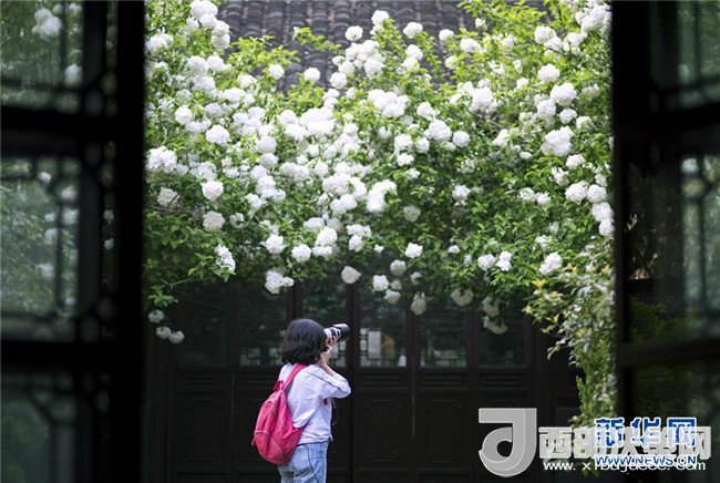 4月11日,一名攝影愛(ài)好者在南京清涼山公園拍攝繡球花。 新華社發(fā)(蘇陽(yáng) 攝)