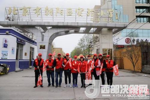 北京市朝陽區(qū)實驗小學(xué)雄安校區(qū),參加“家校警”護學(xué)隊的當(dāng)?shù)丶议L志愿者在校門口。