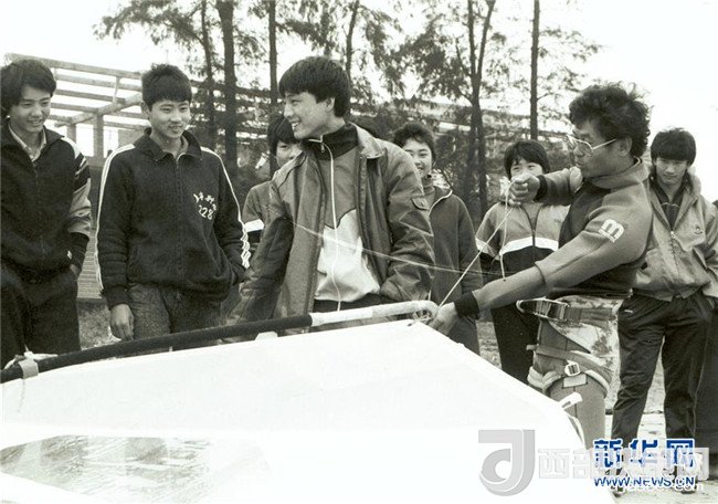 來自臺(tái)灣的帆板運(yùn)動(dòng)員在??诤彤?dāng)?shù)厝罕娊涣鳎?989年1月16日攝)。新華社記者 姜恩宇 攝