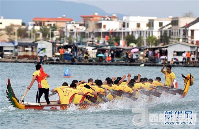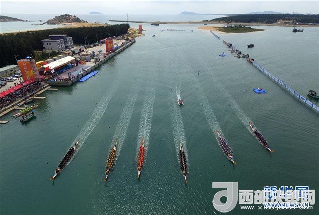運(yùn)動(dòng)員參加在海南萬(wàn)寧和樂鎮(zhèn)港北港舉行的2016中華龍舟大賽萬(wàn)寧站比賽(2016年3月10日無(wú)人機(jī)拍攝)。新華社記者 楊冠宇 攝