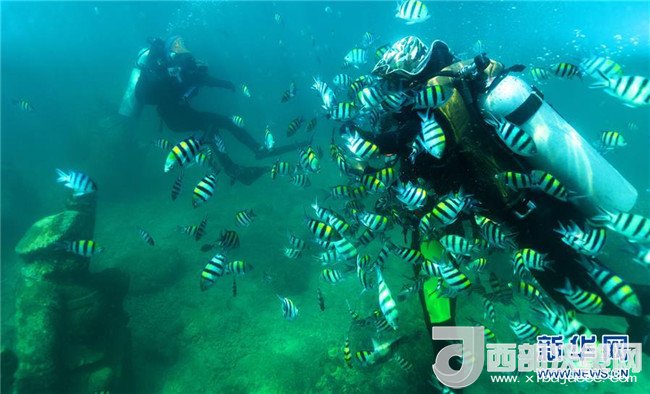 由教練帶領(lǐng)的潛水愛好者在海南省分界洲島附近海域下潛(2017年5月1日攝)。新華社發(fā)(童國(guó)強(qiáng)攝)