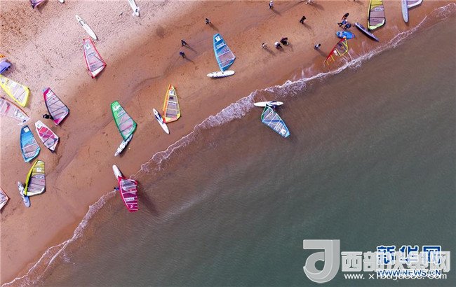 參加2017第四屆國(guó)際旅游島帆板大獎(jiǎng)賽??诖螵?jiǎng)賽的選手在比賽結(jié)束后上岸(2017年11月16日無(wú)人機(jī)拍攝)。新華社記者 楊冠宇 攝