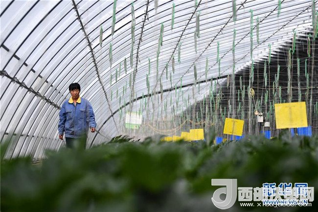 4月18日,甘肅省酒泉市肅州區(qū)總寨鎮(zhèn)總寨村村民范立德在戈壁農(nóng)業(yè)產(chǎn)業(yè)園的日光溫室內(nèi)查看蔬菜生長(zhǎng)情況。