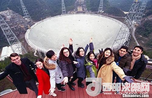 資料圖:留學(xué)生在FAST觀景臺(tái)合影留念。中新社記者賀俊怡攝