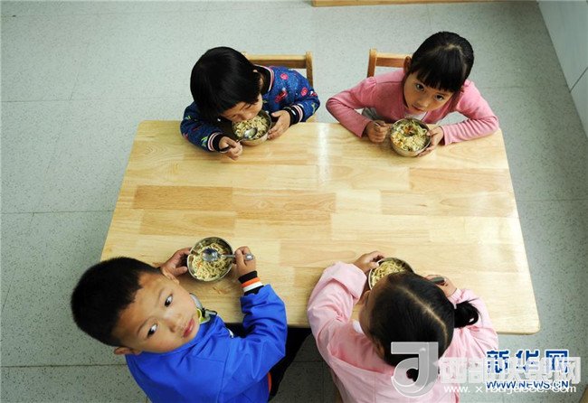 4月23日,吉雪(后排右)和小朋友們在新教室里吃早餐。