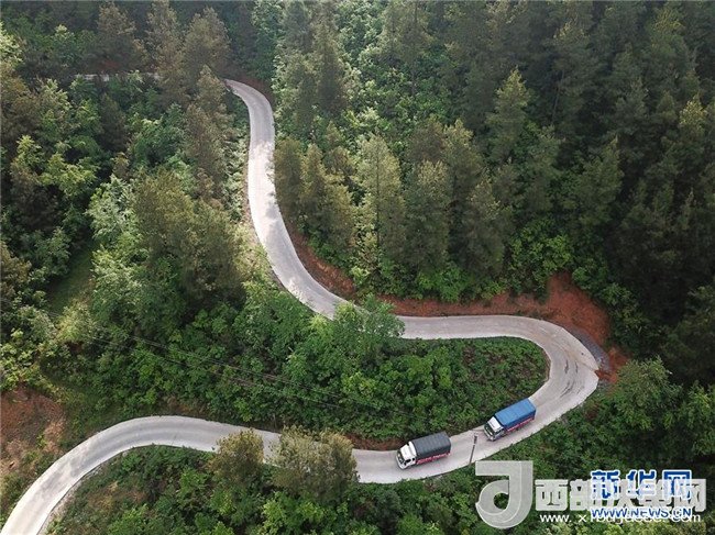 4月22日,幫助吉雪家搬家的貨車行駛在鄉(xiāng)村公路上(無人機拍攝)。