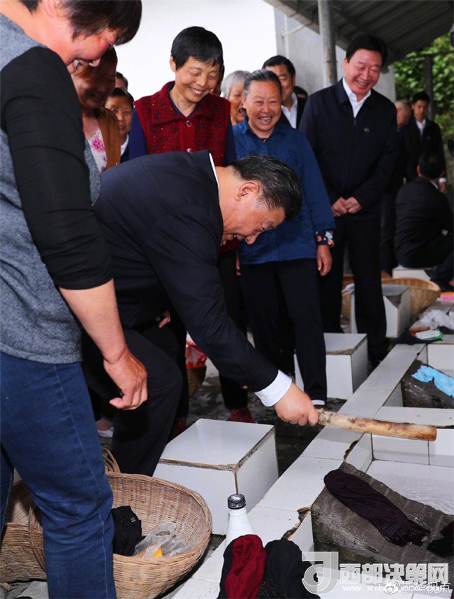 正在村里洗衣服的幾位村民告訴總書記,過(guò)去是在江邊洗衣服,現(xiàn)在村里建起了便民洗衣池,用上了自來(lái)水,污水集中處理,既尊重了生活習(xí)慣又很環(huán)保??倳浗舆^(guò)洗衣用的棒槌,俯下身,試著捶打了幾下衣服,說(shuō):現(xiàn)在洗衣服也是綠色環(huán)保的了。習(xí)近平說(shuō),看見(jiàn)大家日子過(guò)得好,我高興!