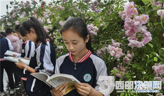 木魚(yú)中學(xué)的學(xué)生們?cè)谛@的鮮花叢中閱讀課文(4月24日攝)。