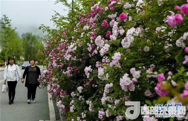 4月26日,游人走在開(kāi)滿鮮花的新青川縣城街道上。新華社記者陶明攝