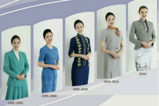 歲月變遷,以優(yōu)質(zhì)服務贏得客戶青睞的初心不改。圖為海航空乘人員的五代服裝,反應了時代的變化。