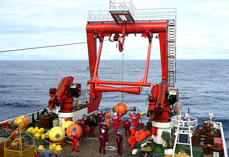 在我國新一代海洋綜合科考船“科學”號上,科考隊員正在布放潛標(2017年12月10日攝)。新華社記者 張旭東 攝
