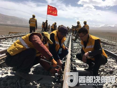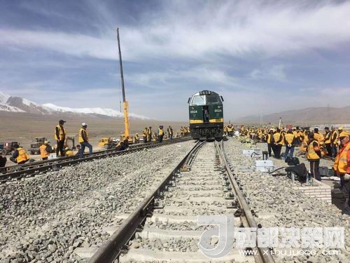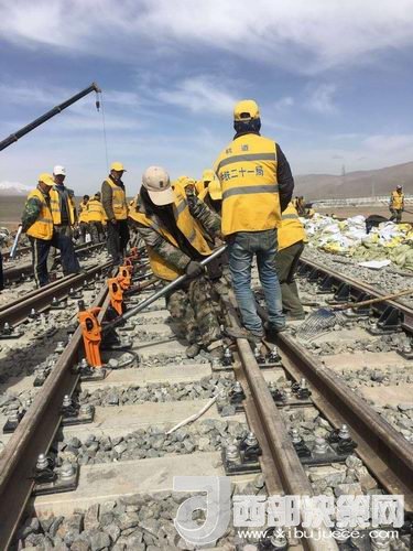 在玉珠峰車站施工現(xiàn)場(chǎng),600余名工人正在緊張的進(jìn)行螺紋道釘錨固定、搗道石、安裝枕木連接板等操作。橘黃色的工作服在遠(yuǎn)處皚皚雪山的映照下分外醒目和溫暖。中鐵二十一局格拉擴(kuò)能改造工程指揮部總工李先告訴記者:“這個(gè)車站的改造由車站北側(cè)增加2條到發(fā)線,在車站的西側(cè)增加3股道的專用裝卸線。涉及到路基、橋涵、房建、軌道、通信、信號(hào)、電力7個(gè)專業(yè)。”