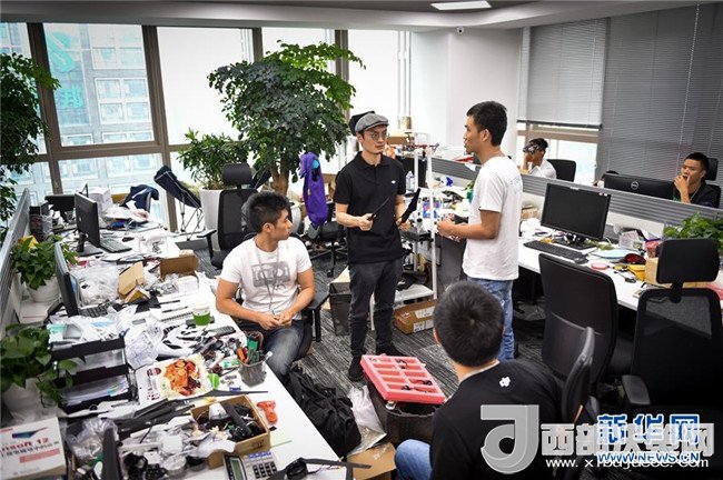 在深圳科技園的大疆創(chuàng)新總部,民用無人機(jī)領(lǐng)軍者汪滔(中)參與研發(fā)人員的討論(2015年5月22日攝)。新華社記者毛思倩攝