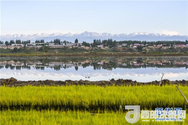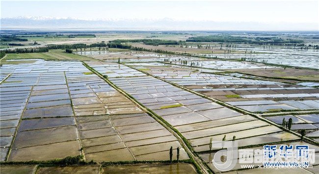 在新疆察布查爾錫伯自治縣種羊場托海依村拍攝的一處農(nóng)田,秧苗與遠處的雪山相映成趣(5月21日攝)。近日,隨著氣溫漸高,地處新疆伊犁河谷的察布查爾錫伯自治縣迎來插秧高峰期,田間地頭一派繁忙景象。塊塊稻田水滿如鏡,田間防護林枝繁葉茂,遠處雪山依稀可見,如一幅在大地上鋪展開的生態(tài)畫卷。新華社記者胡虎虎攝