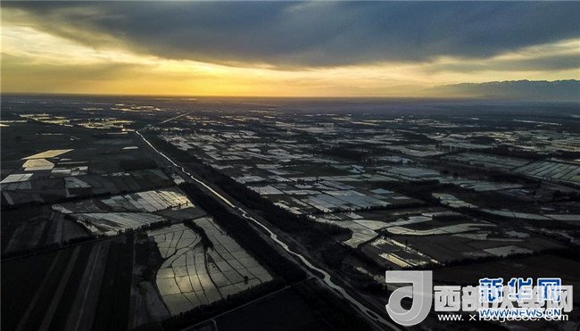 在新疆察布查爾錫伯自治縣種羊場托海依村拍攝的夕陽下的農(nóng)田(5月21日無人機拍攝)。近日,隨著氣溫漸高,地處新疆伊犁河谷的察布查爾錫伯自治縣迎來插秧高峰期,田間地頭一派繁忙景象。塊塊稻田水滿如鏡,田間防護林枝繁葉茂,遠處雪山依稀可見,如一幅在大地上鋪展開的生態(tài)畫卷。新華社記者胡虎虎攝