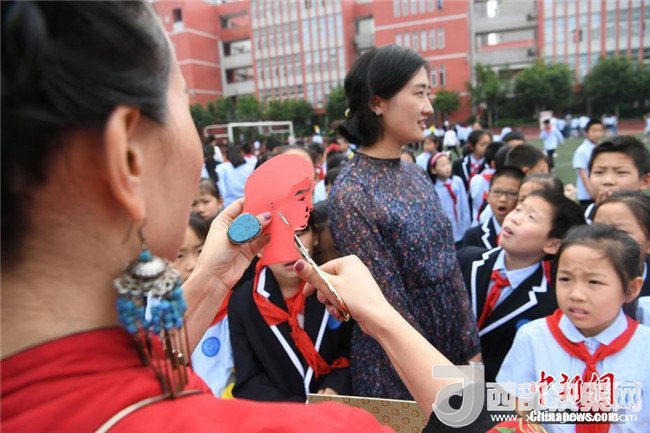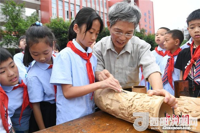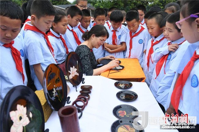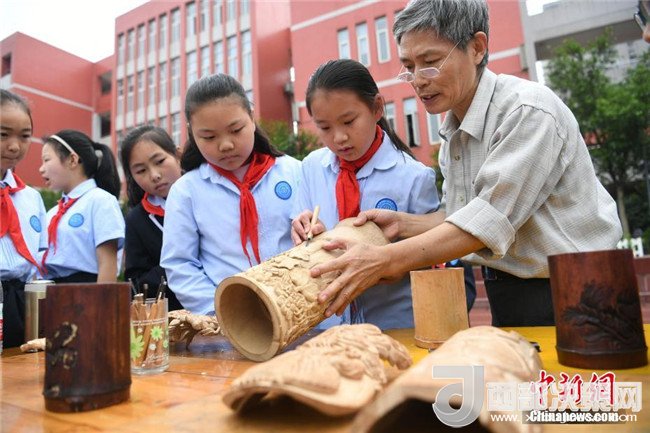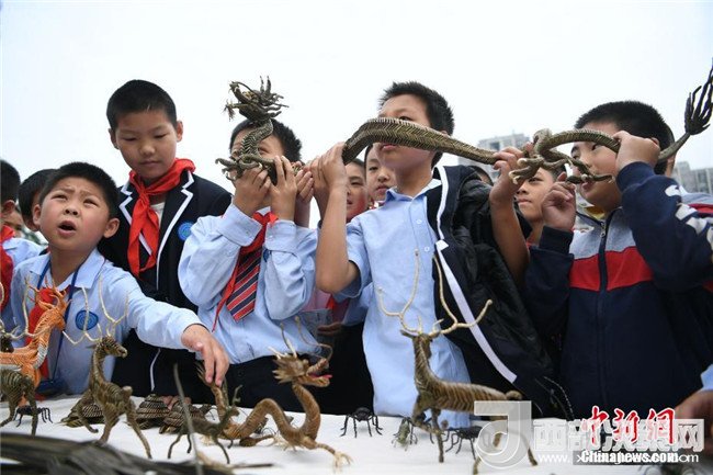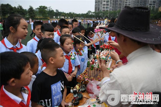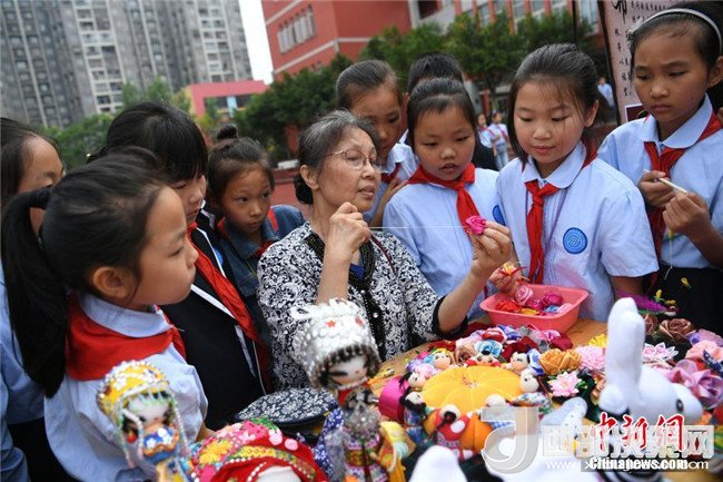 活動(dòng)現(xiàn)場,15個(gè)國家級(jí)和市級(jí)非物質(zhì)文化遺產(chǎn)項(xiàng)目為重慶沙坪壩西永第一小學(xué)校的師生帶來一場豐盛文化遺產(chǎn)大餐,讓師生們近距離感受了中華優(yōu)秀傳統(tǒng)文化的魅力。圖為活動(dòng)現(xiàn)場學(xué)生們參觀非物質(zhì)文化遺產(chǎn)項(xiàng)目。 陳超 攝