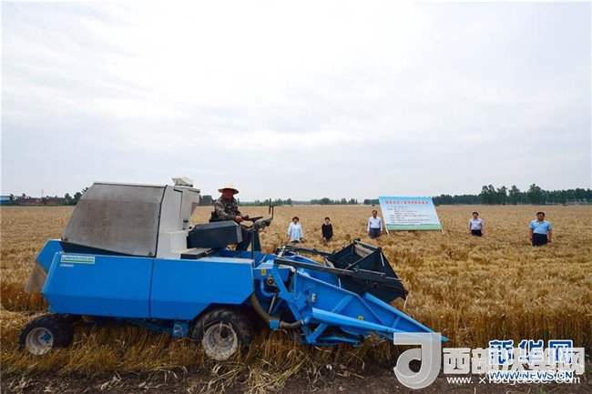 5月29日,在河南省鄧州市腰店鎮(zhèn)國家雜交小麥項(xiàng)目制種基地,收割機(jī)正在收割小麥。
