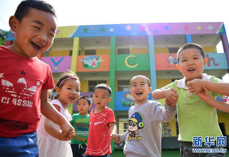 陜西省安康市漢濱區(qū)雙龍鎮(zhèn)杜壩村五四小學附設幼兒園小朋友們在操場上做游戲(2017年6月16日攝)。這個幼兒園使用貸款資金翻修改造而成,有效解決了該村及周邊兒童學前教育缺失的問題。新華社記者 邵瑞 攝