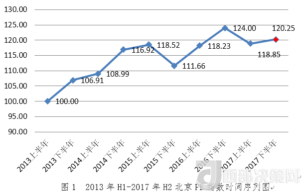 2017年下半年北京PE指數(shù)為120.25,環(huán)比增長1.18%,同比下降3.03%。從指數(shù)走勢看,2017年下半年北京PE指數(shù)較上半年穩(wěn)步回升,仍處于高位。