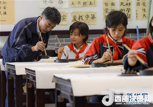 2017年9月26日,在新疆疏附縣托克扎克鎮(zhèn)中心小學(xué)書(shū)法教室內(nèi),王莊鐵老師在教同學(xué)們寫(xiě)毛筆字。新華社記者 趙戈 攝