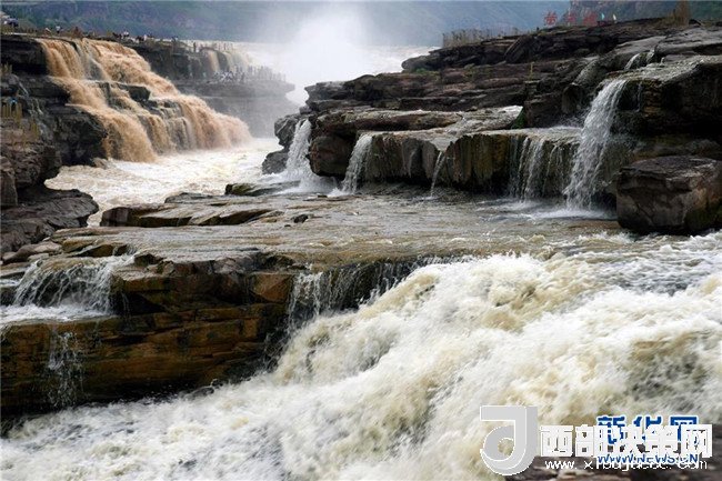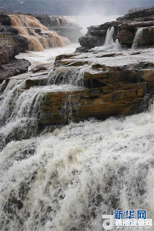 近日,受上游局部地區(qū)強(qiáng)降雨影響,黃河壺口瀑布出現(xiàn)西邊濁浪翻滾、東邊白浪滔滔的奇特景觀,吸引了眾多游客前來觀看。 新華社發(fā)(呂桂明 攝)