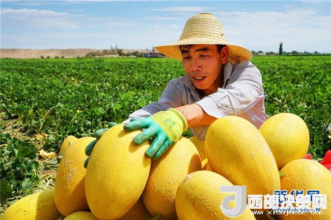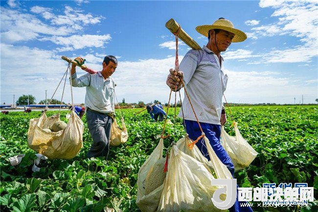 6月27日,新疆哈密市伊州區(qū)南湖鄉(xiāng)瓜農(nóng)在挑運(yùn)哈密瓜。