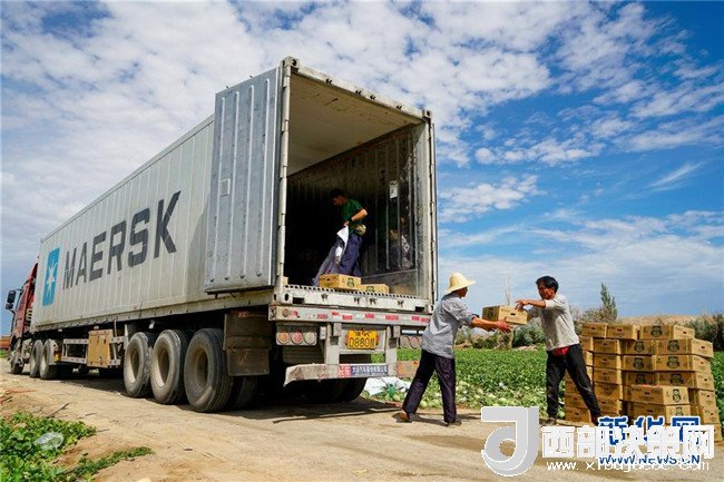 6月27日,新疆哈密市伊州區(qū)南湖鄉(xiāng)瓜農(nóng)把剛采摘的哈密瓜裝入冷藏廂式貨車外運(yùn)。