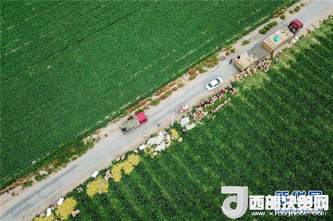 6月27日,新疆哈密市伊州區(qū)南湖鄉(xiāng)瓜農(nóng)將采摘的哈密瓜堆放在地頭,準(zhǔn)備裝車外運(yùn)(無(wú)人機(jī)拍攝)。