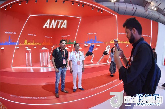 在一年一度的中國(晉江)國際鞋業(yè)暨國際體育產(chǎn)業(yè)博覽會(huì)上,來自印度的客商在安踏展位前留影(4月19日攝)。新華社記者 宋為偉 攝