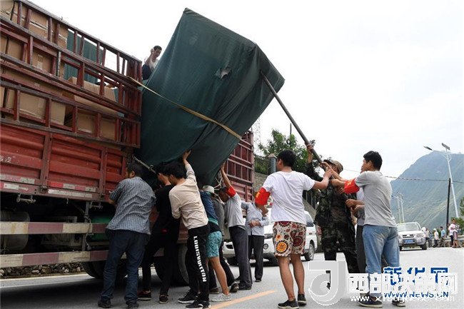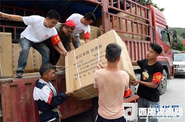 7月15日,在舟曲縣南峪鄉(xiāng),志愿者及村民從車輛上搬運救災物資。