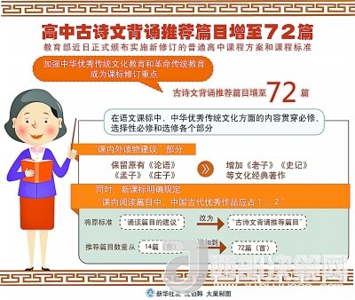 其中,語文課標(biāo)最突出,中華優(yōu)秀傳統(tǒng)文化方面的內(nèi)容貫穿必修、選擇性必修和選修各個部分。一是內(nèi)容更全,在“課內(nèi)外讀物建議”部分,除保留原有《論語》《孟子》《莊子》外,增加了《老子》《史記》等文化經(jīng)典著作,要求學(xué)生廣泛閱讀各類古詩文,覆蓋先秦到清末各個時期。二是分量更多,課程標(biāo)準(zhǔn)明確規(guī)定“課內(nèi)閱讀篇目中,中國古代優(yōu)秀作品應(yīng)占1/2”。三是要求更高,在全面加強(qiáng)的同時,還設(shè)置中華優(yōu)秀傳統(tǒng)文化學(xué)習(xí)專題,進(jìn)行中華傳統(tǒng)文化經(jīng)典作品深入學(xué)習(xí)研討。將原標(biāo)準(zhǔn)“誦讀篇目的建議”改為“古詩文背誦推薦篇目”,推薦篇目數(shù)量也從14篇(首)增加到72篇(首),提高了學(xué)習(xí)要求。