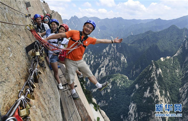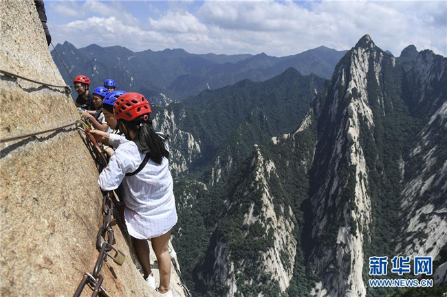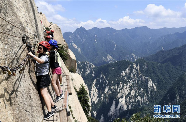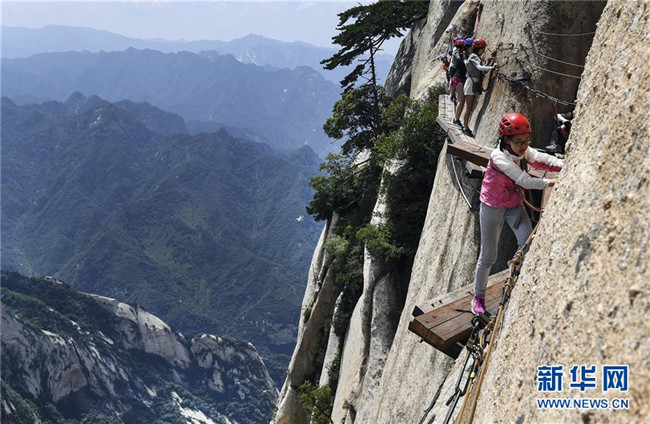被譽(yù)為“華山第一天險(xiǎn)”的長空棧道,位于陜西省華陰市五岳華山南峰東側(cè)山腰,在萬仞絕壁上鑲嵌石釘搭木椽而筑。 由于長空棧道貼崖懸空,對探險(xiǎn)獵奇者極具誘惑性和挑戰(zhàn)性,吸引歷險(xiǎn)探勝者絡(luò)繹不絕。新華社記者 陶明 攝