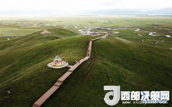 游客在瑪曲縣阿萬倉濕地的觀景步道上游覽(7月31日無人機(jī)拍攝)。新華社記者 陳斌 攝