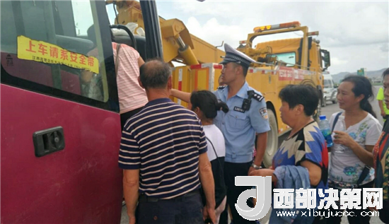 西部決策網(wǎng)-西部大開(kāi)發(fā)訊(記者帥華鋒 通訊員 馬存福 蘇娟)7月31日上午,甘肅西和縣公安局交警大隊(duì)高速中隊(duì)執(zhí)勤民警巡邏至十天高速西和段上行線天水方向(西和隧道附近),發(fā)現(xiàn)一輛大客車??吭诼愤?,當(dāng)時(shí)高速行駛的車輛川流不息,車輛沒(méi)有停放在安全地帶,存在著極大的安全隱患。民警上前立即查看情況,發(fā)現(xiàn)車輛故障,67名乘客被困于高速,乘客大多數(shù)為婦女與兒童,由于天氣炎熱,長(zhǎng)時(shí)間困于車輛中,情緒焦急不安,存在諸多不安全因素,見(jiàn)此情況,民警立即在故障車輛兩百米外設(shè)置安全提示牌,擺放錐桶,現(xiàn)場(chǎng)指揮過(guò)往車輛,提醒車輛減速慢行,做好防護(hù)的同時(shí),利用巡邏警車將車上乘客有序轉(zhuǎn)移到一公里外的停車區(qū),積極聯(lián)系高速公路救援中心將故障車輛進(jìn)行拖移,盡快撤離高速,恢復(fù)交通秩序。
