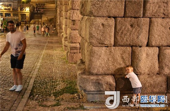 這是8月5日在西班牙塞哥維亞拍攝的古羅馬輸水道夜景。