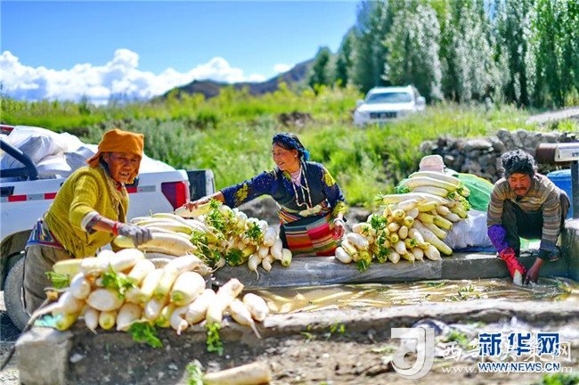 8月8日,村民在邊雄鄉(xiāng)蘿卜種植基地田頭的水池清洗蘿卜。新華社記者 張汝鋒 攝