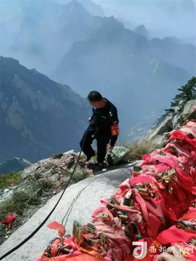 1979年出生的馮凱是華山景區(qū)負(fù)責(zé)蒼龍嶺段的一名安保員。這條長300米的責(zé)任路段,是華山最為險(xiǎn)峻的地勢之一。單行,游客只能朝上攀爬;狹窄,臺階不足一米寬;陡峭,需要手腳并用,極為消耗體力。年紀(jì)稍大的游客腿腳不靈活,馮凱迅速上前攙扶;年幼的孩子走不動了,哭鬧不止,馮凱幫助孩子家長,帶著一家人順利通過;小姑娘爬山爬累了,坐在臺階上休息,馮凱要第一時(shí)間勸導(dǎo)她到云海平臺安全處再休息;有些游客喜歡在奇險(xiǎn)處擺各種姿勢拍照,馮凱也要耐心細(xì)致地保護(hù)周全,以防意外,同時(shí)疏導(dǎo)人群,防止踩踏。遇到游客吸煙,馮凱要及時(shí)制止,耐心解釋。不間斷地巡查,馮凱是為了檢查鐵欄桿是否松動,臺階是否有破損,安全標(biāo)識是否完整。為了能第一時(shí)間出現(xiàn)在游客的身邊,300米的距離,馮凱得上上下下,走來走去幾十遍。這些都是馮凱的工作,而馮凱的工作內(nèi)容卻不僅僅是這些。